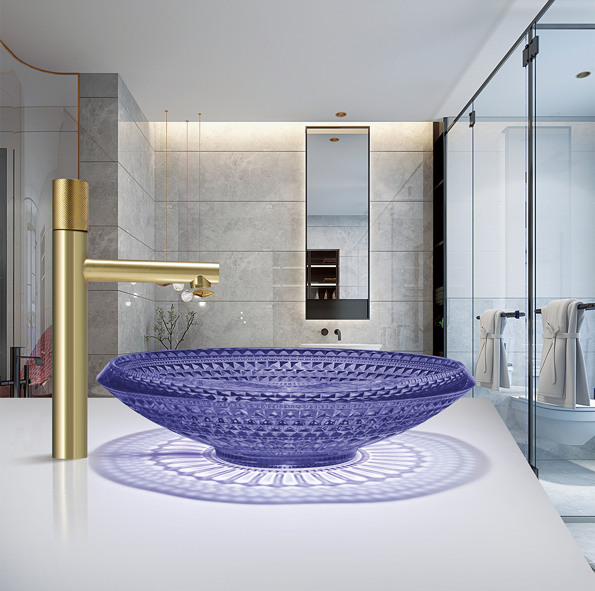 Lavamanos de sobreponer Luxor en vidrio templado violeta, pensado para quienes buscan diseño vanguardista y funcionalidad. Su instalación sobre encimera permite un acabado limpio y minimalista, mientras que el vidrio templado de alta resistencia aporta seguridad y un toque de sofisticación al baño.